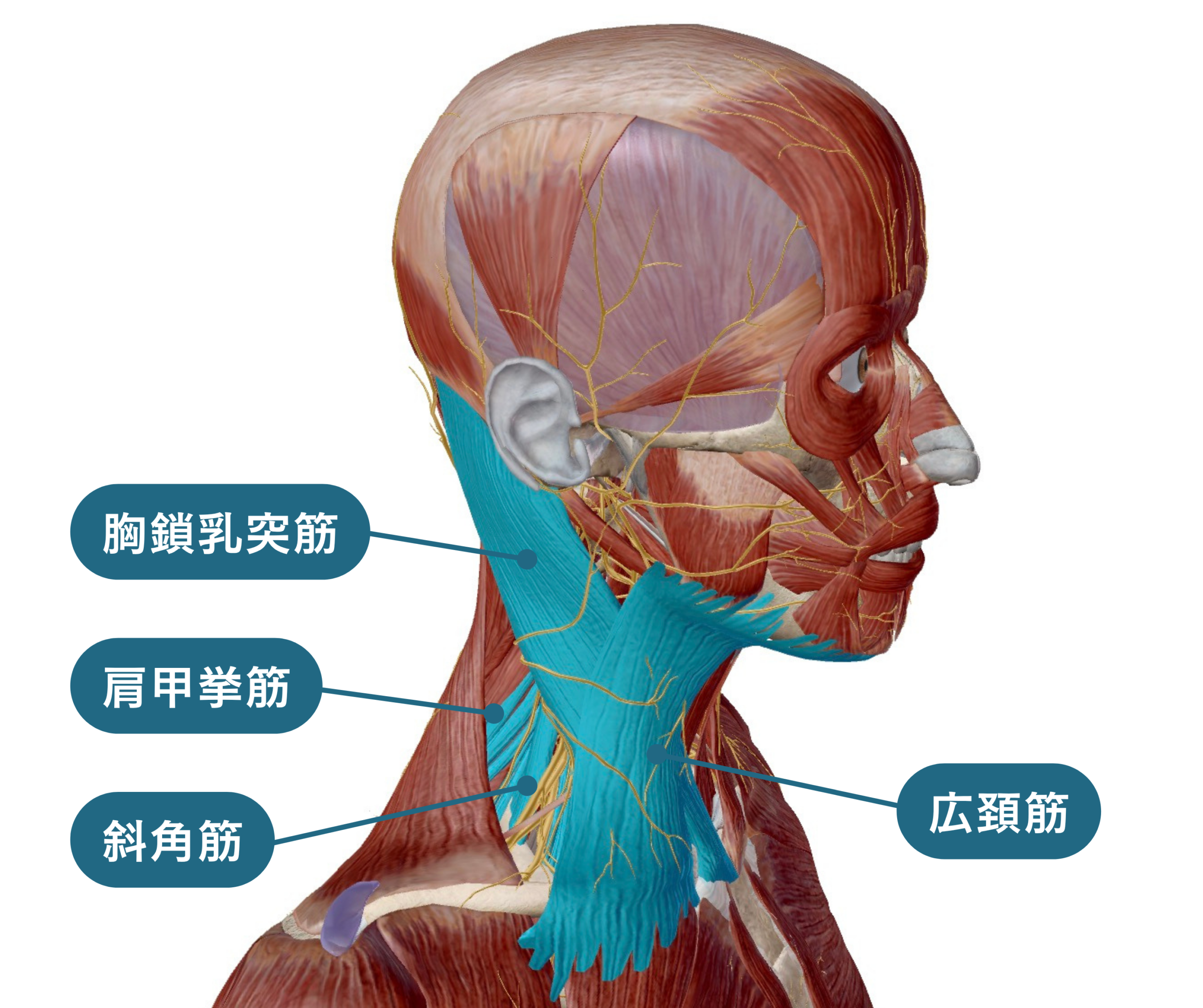 首後ろや鎖骨付近など、筋肉は単体ではなく
